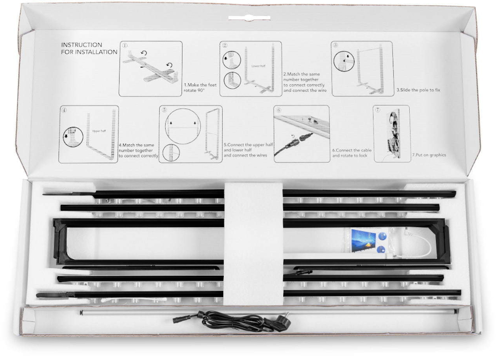 Das Set enthält: LumiFrame Box, Netzteil (1 Stück), Silikonband, Transporttasche.